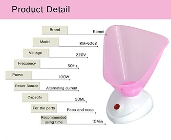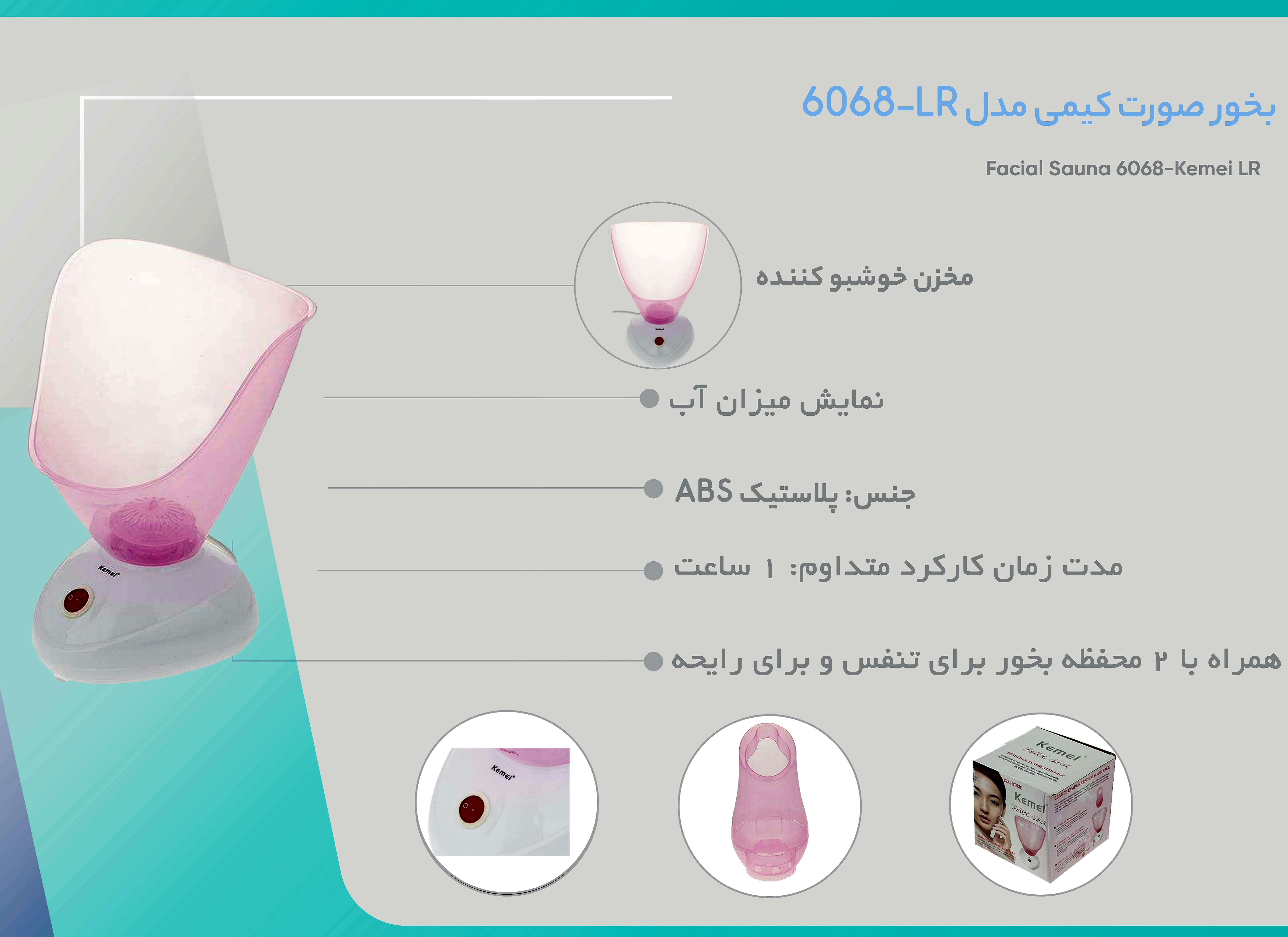 دستگاه بخور صورت کیمی مدل KM-6068، این دستگاه از پلاستیک ABS ساخته شده و ظرفیت مخزن آب 0.1 لیتری است که 2 محفظه بخور برای تنفس و رایحه دارد، همچنین دارای مخزن خشبوکننده می باشد.